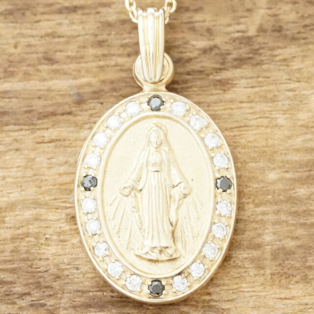 マリアの周りにはメインでクリアのダイヤモンド、アクセントとして4箇所にブラックダイヤモンドが施されており、石は全てツメ留めされています。