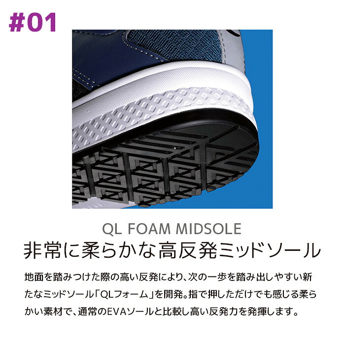 21250951 ネイビー21250952 ブラック/グレイ 21250953 ブラック/レッド21250954 ブラック跳ねるように動ける 異次元の反発力 Quantum leap 品番 QL-01 #01 QL FOAM MIDSOLE 非常に柔らかな高反発ミッドソール 地面を踏みつけた際の高い反発により、次の一歩を踏み出しやすい新たなミッドソール「QLフォーム」を開発。