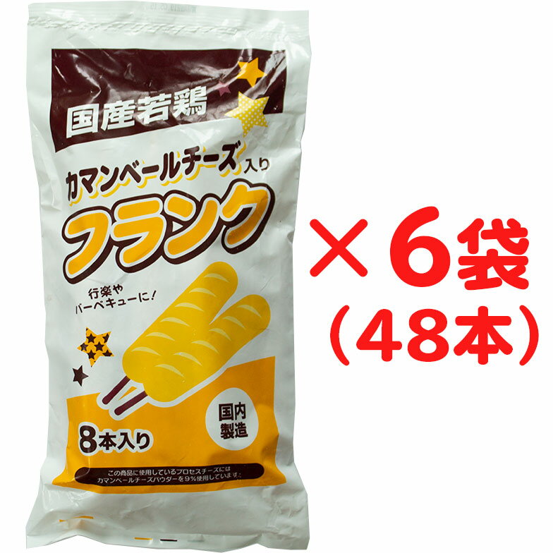 ■48本(送料・税込) 1本当たり80円 商品説明商品名業務用フランク カマンベールチーズ入り 加熱食肉製品(加熱後包装)名称フランクフルトソーセージ原材料名 鶏肉(国産)、豚脂肪(国産)、プロセスチーズ、でんぷん、粉末状植物性たんぱく、糖類(ぶどう糖、砂糖、乳糖)、食塩、ばれいしょ繊維、香辛料、たんぱく加水分解物、植物油脂/調味料(アミノ酸等)、リン酸塩(Na)、乳化剤、pH調整剤、酸化防止剤(V.C)、セルロース、香辛料抽出物、発色剤(亜硝酸Na)、着色料(コチニール)、(一部に乳成分・牛肉・大豆・鶏肉・豚肉を含む) 内容量3456g((72g×8本)×6袋)賞味期限【冷凍】2019.8.25保存方法 −15℃以下で保存してください 商品特徴加熱済み商品です。